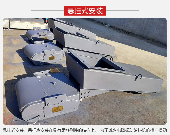 電磁振動(dòng)給料機(jī)一般采用懸掛式安裝,吊桿應(yīng)安裝在具有足夠剛性的結(jié)構(gòu)上, 為了減少電磁振動(dòng)給料機(jī)的橫向擺動(dòng), 懸掛吊桿應(yīng)向外張開 10°左右布置。對(duì)于大型給料機(jī), 為了維修和更換料槽方便,還應(yīng)設(shè)置移動(dòng)滑架。