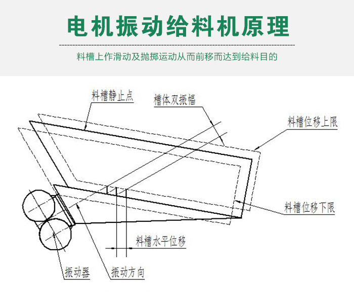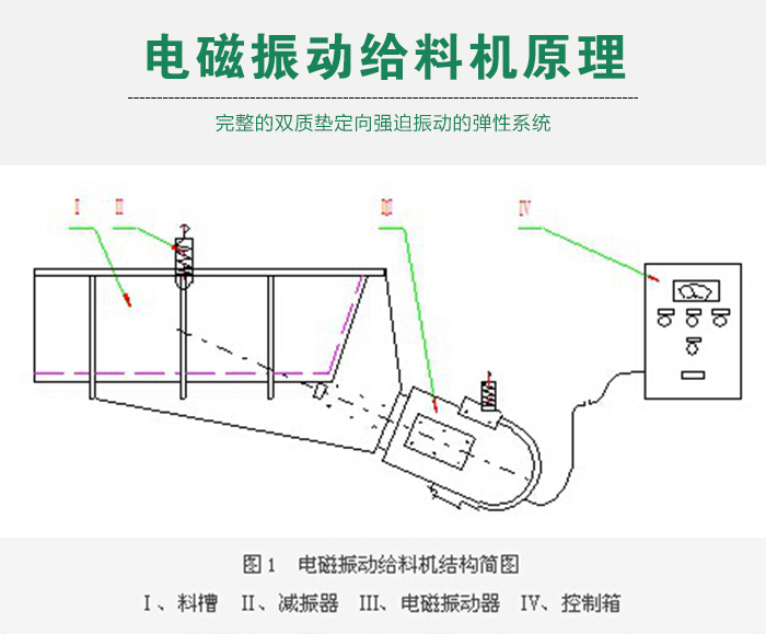電磁振動給料機是一個較為完整的雙質(zhì)墊定向強迫振動的彈性系統(tǒng), 整個系統(tǒng)工作在低臨界共振狀態(tài),主要利用電磁激振器驅(qū)動槽體以一定的傾角做往復(fù)振動,使物料沿槽移動。