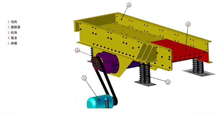 1.給料槽為鋼板、支承梁、筋坂等組成的焊接結構,兩端焊有4個托架,支承在彈簧支座上。振動器為雙軸強迫同步的塊偏心振動器,兩根軸上的偏心塊齒輪裝置保持反向旋轉。振動器運動軌跡為與槽體成30度角的直線,給料機的入料端和出料端的運動軌跡呈扁平的橢圓形。